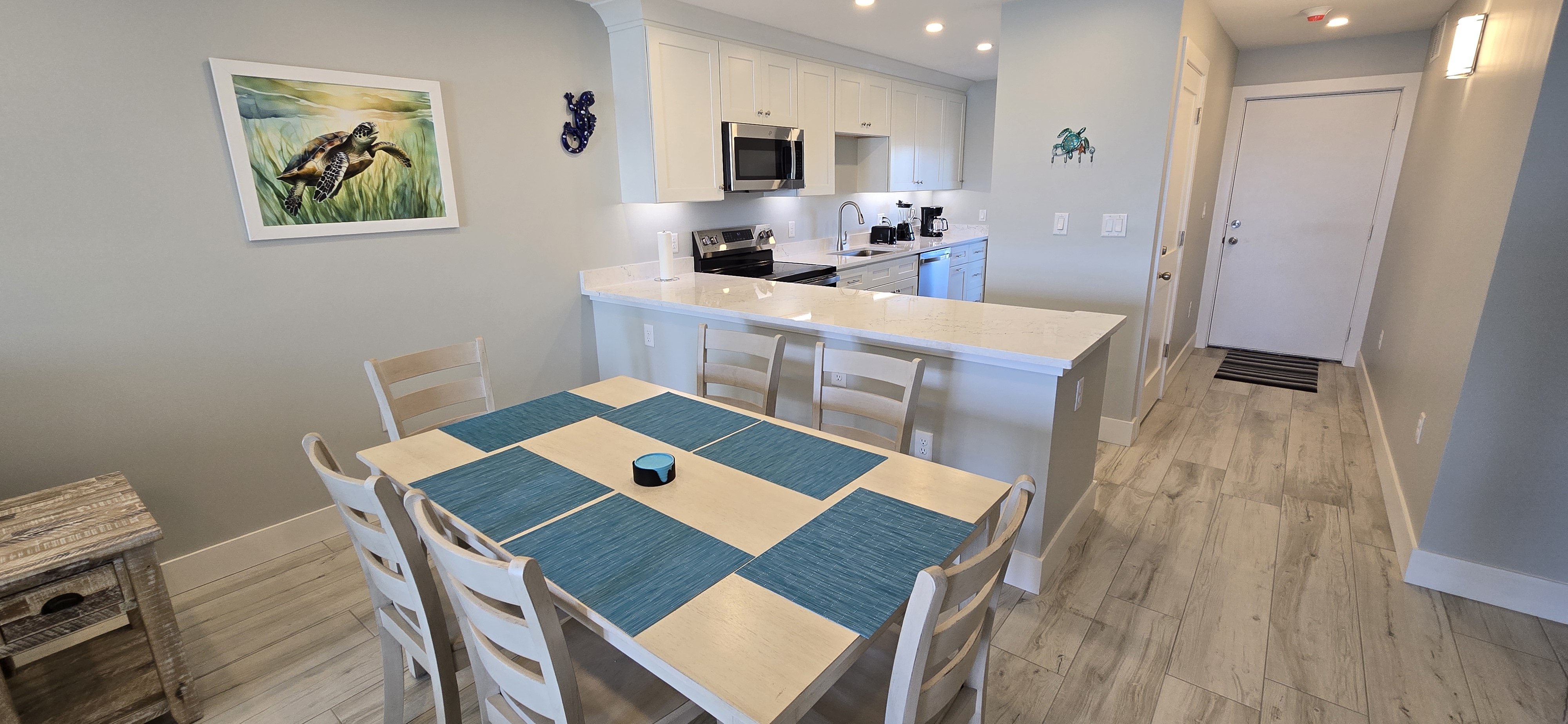 Comforts of Home - This thoughtfully appointed, fully renovated condo features tile floors throughout—perfect for sweeping off those sandy feet. Full kitchen equipped with a variety of small appliances ready for your use. A Full-size washer and dryer are included as well as HDTV's in every room and dedicated high-speed internet.