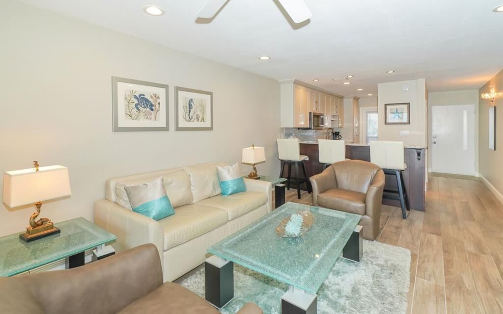 Fisherman's Cove, Siesta Key Gulf Front! Sandwiched between the Gulf and Blind Pass Lagoon which leads to Sarasota Bay, you can enjoy sunning or fishing from the Gulf or Lagoon or kayaking and paddle boarding. Our Siesta Key location on the island's south end features the best shelling on the island as well. The Gulf waters are only 150 feet from your beachfront lanai. Enjoy romantic sunsets from the comfort of your apartment's private terrace or directly on the beach.
