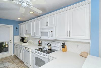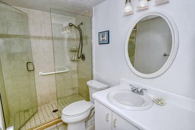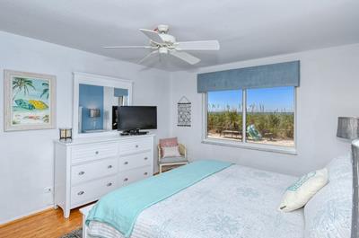 Sleep at night with the ocean surf right outside your window! The master bedroom has a bay window overlooking the Gulf and beach below. It has a king-size bed, large HDTV, walk-in closet, and ensuite bathroom with a large tiled shower. The second bedroom has a twin-size plus queen-size bed, and a large window overlooking the bay and boat docks. Additionally, a twin self-inflating/deflating aerobe is provided that can be placed wherever you choose. The second full bath has a tub/shower combo.