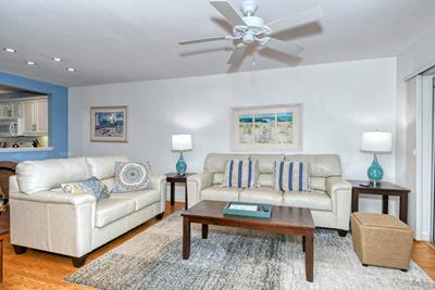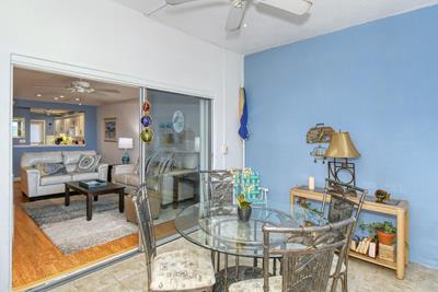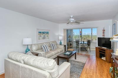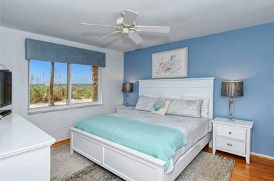This unit is on the ground floor and you can walk right out the lanai onto the sand!! Recently upgraded with new furnishings, decor, and paint throughout. Flooring is a mixture of modern tile, wood (parquet) in the living spaces and master bedroom and carpet in the 2nd bedroom. The kitchen has Corian countertops with tiled backsplash, and modern appliances including refrigerator, range/oven, dishwasher and microwave. The kitchen is fully equipped including a range of small appliances. The dining area has seating for six and is right off the kitchen. The living room has a leather couch and chair, large flat panel HDTV and an amazing view out to the lanai and the Gulf. The air-conditioned lanai has sliders looking out to the Gulf and the beach. This unit also has glass sliders between the living room and Lanai giving the option of closing it off so the inside is air-conditioned but sliders can be opened on the Lanai. It is furnished with chairs and table to let you get comfortable as close to the water as possible.