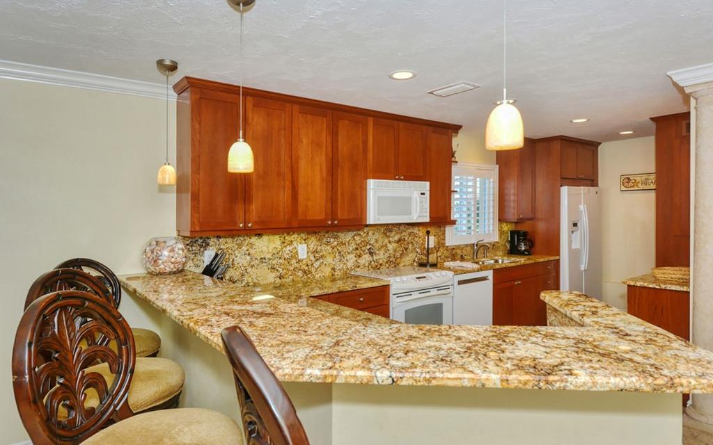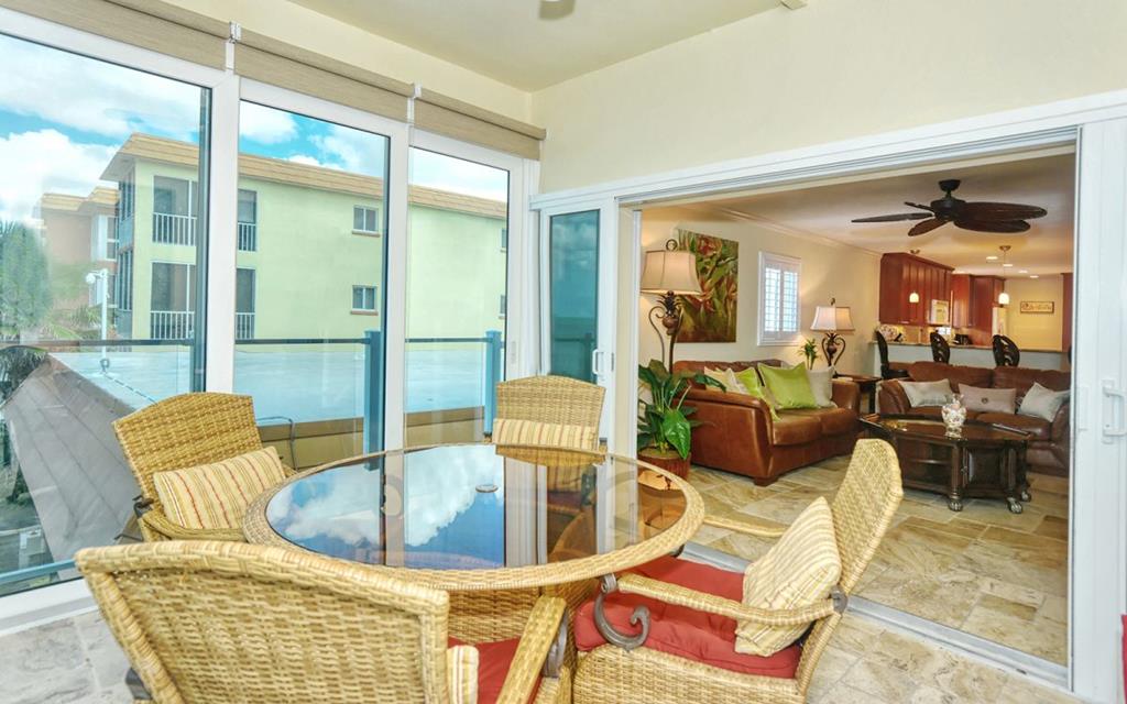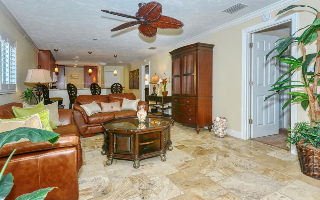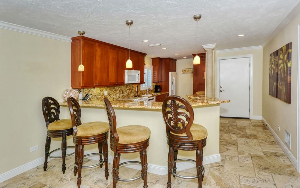 The unit features travertine flooring throughout, carpet in the bedrooms, cable television, wireless internet access, fully equipped kitchen, a heated community pool, boat slips, kayak launching and assigned parking.