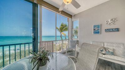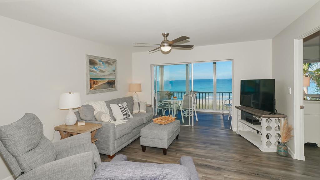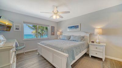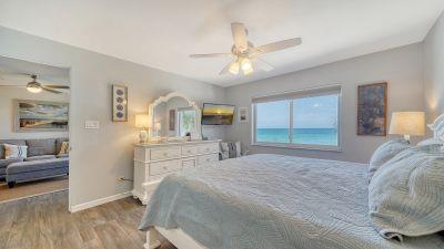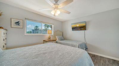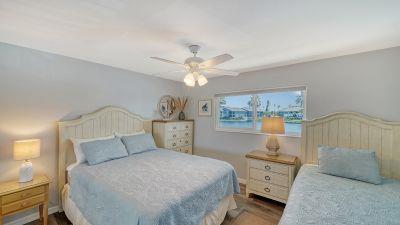 The master bedroom includes a king bed, Gulf view, room-darkening shades, a TV, and a hotel-style safe for peace of mind. The second bedroom offers a queen bed, twin bed, bay view, room-darkening shades, and a TV. Both bedrooms feature new mattresses, linens, and quilts, and our exceptional cleaning team ensures the highest standards throughout your stay.